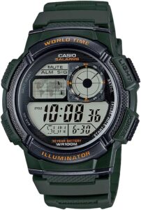 Casio AE1000W Series | Men’s Digital Watch | 100M WR | Multi Alarms | 100 SEC Stopwatch | Countdown Timer | World Map for World Time | LED Light | LC Analog Display | 10 Year Battery