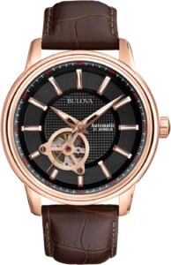 Bulova Men’s Classic 3-Hand Automatic Leather Strap Watch, 21-Jewels, Hack Feature, Luminous Hands and Markers,Open Aperture and Exhibition Case Back