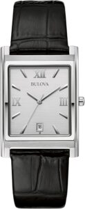 Bulova Men’s Stainless Steel 3-Hand Calendar Date Quartz Watch with Black Leather Strap, Rectangle Dial Style: 96B107