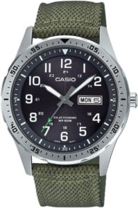 Casio MTPS120L Series | Unisex Analog Watch | 100M WR | Stainless Steel Case | 3 Hand Analog (HR, Min, SEC) | Date Display | Low Battery Alert | Military Styling | Solar Powered